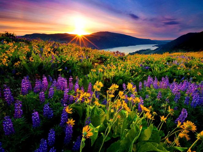 Im Elfenland ist früher Morgen. Strahlend geht die Sonne über den Spitzen der Berge auf, die weit hinten am Rand der blumengeschmückten Wiese zu sehen sind.