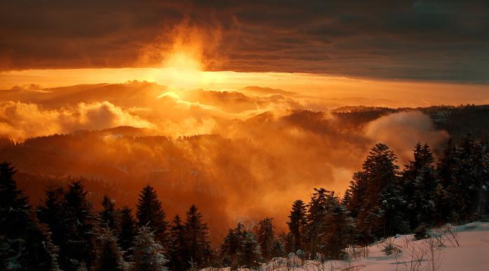 Schau noch einmal über die Gipfel der hohen Berge, wo die hellleuchtende Sonne die schneebedeckten Spitzen erstrahlen lässt.